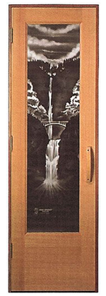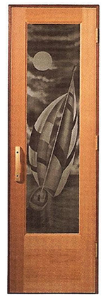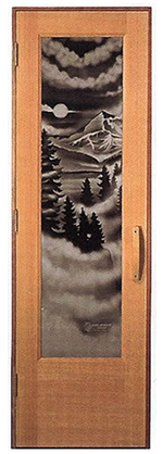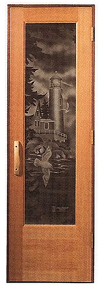 Our exclusive glass options have been custom designed and etched by an artist. When ordering this option, you have a choice of two unique Sauna designs in positive or negative image, a choice of our beautiful Scenic Designs: Mt. Hood, Multnomah Falls, Liberty, Lighthouse, or Sailboat image. Artwork is sealed inside the insulated glass unit so that etchings are protected from smudging or scratching. Etchings are available for the 24" door size only but some custom sizes may be special ordered.