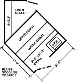 Below is an example of the importance of pre-planning when designing a Sauna. Plan A and B have exact shape and size. Plan A uses the entire space as a Sauna, resulting in benches with little seating space and no reclining area. There is too much walking area-with a waste of space, building material and efficiency. Plan B creates 2 useable rooms from the same space, allows a Sauna with a more comfortable bench area, and leaves necessary walking space. The linen closet is a bonus.